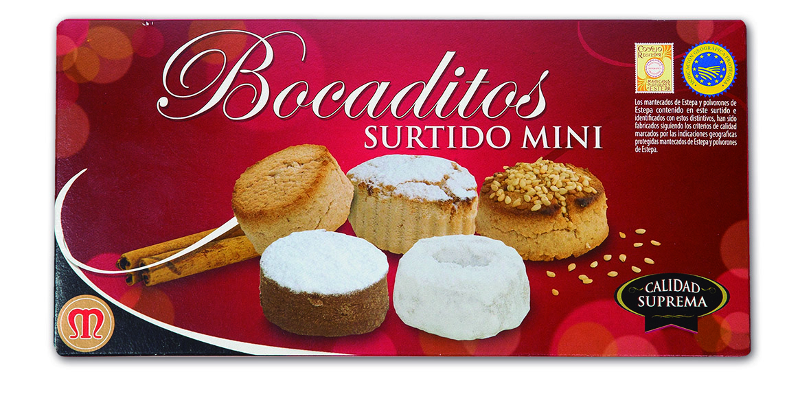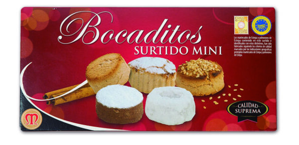 Contenido: Mini Mantecado de Estepa de Canela, Mini Mantecado de Estepa de limón, Mini Mantecado de Estepa de Cacao, Mini polvorón de Estepa de Almendra (9%) y Mini Rosco de Vino.