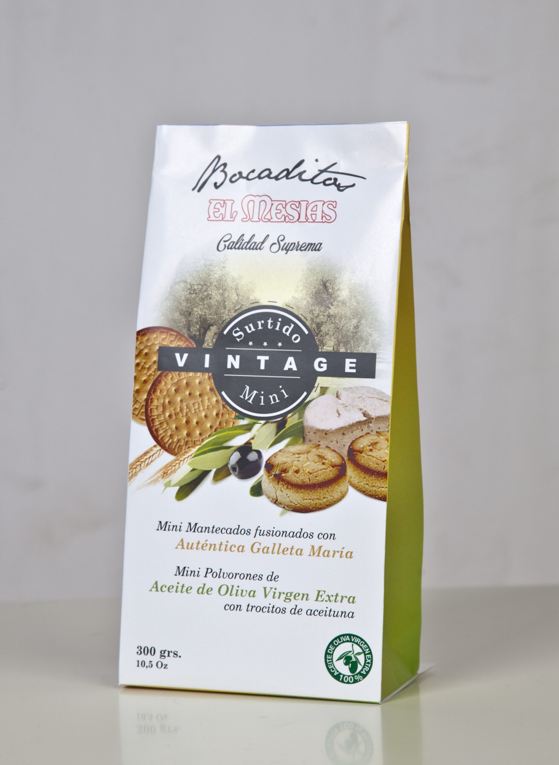 Contenido: Polvorones fabricados con Aceite de Oliva Virgen Extra D. O. Estepa, con trozos de aceituna, y Mantecados con auténtica Galleta María. Cuatro viejos sabores unidos en dos únicos.